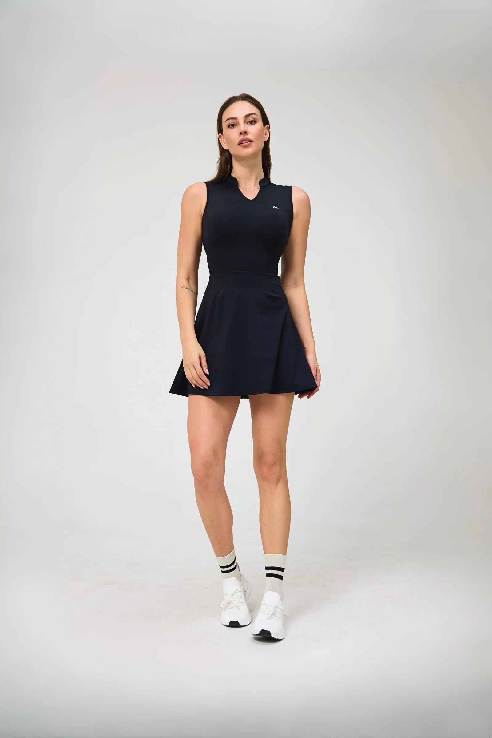 The AMpower Dress thoughtfully crafted from recycled materials, this sleeveless athletic dress is a statement of both style and sustainability. Its contoured fit enhances your natural silhouette, while the flowy skirt offers freedom of movement ; perfect for the court, gym, or casual days out. With its sleek collar detail and minimalist branding, this dress effortlessly blends sporty functionality with everyday sophistication. Step into confidence and comfort, because looking good and doing good should go hand in hand.