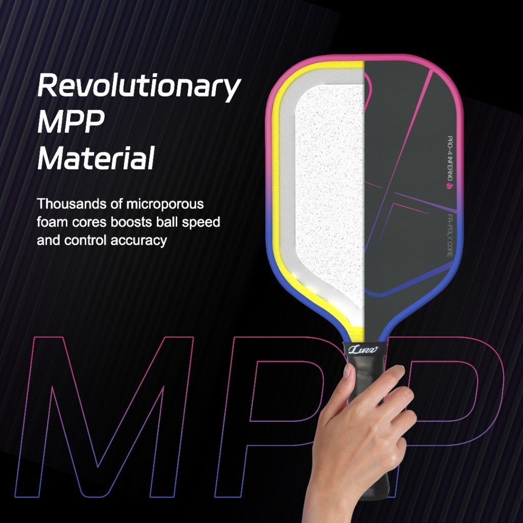 Engineered with revolutionary MPP (Microporous Polymer) material and cutting-edge foaming technology, the Luzz Pro 4 Inferno Pickleball Paddle delivers blazing speed, pinpoint control, and unrelenting durability. Ignite your game and leave opponents in the dust with every explosive strike.